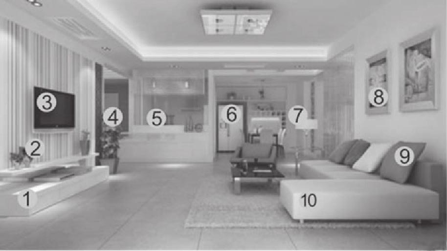 ⑥冰柜;⑦台灯;⑧名画;⑨沙发靠背;⑩沙发