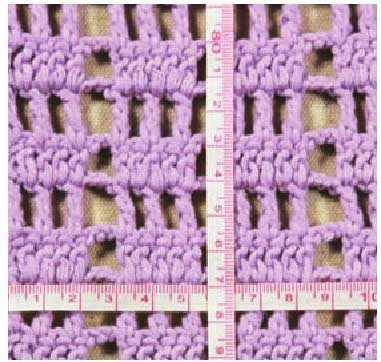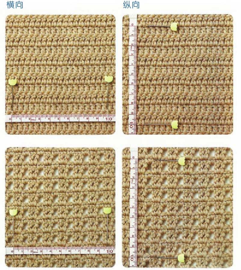 用长针编织边长大于10cm的正方形织片,并整理平整,将测量用的卷尺分别沿水平和竖直方向平直放置在织片上,在卷尺数字0、10处相对应的织片上,用大头针穿入作记号。移开卷尺,分别在同方向数出两处记号之间的针数和行数,右图中所测量的10cm是17针、10行,在编织图中的标注:长针编织17针×10行/10cm。