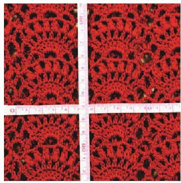 规则花样的织片可直接数出10cm的针数、行数。复杂花样的织片则要测量1花样的横向尺寸、纵向尺寸。复杂小花样的织片,若只量1花样的大小会有误差,所以应先测量接近10cm的花样数,再推算出1花样的尺寸(cm)较适宜。例如: