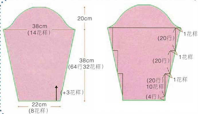 1.算出袖底线的行数和加针数。在此算出袖底线64行(32花样)中需做3花样的加针。