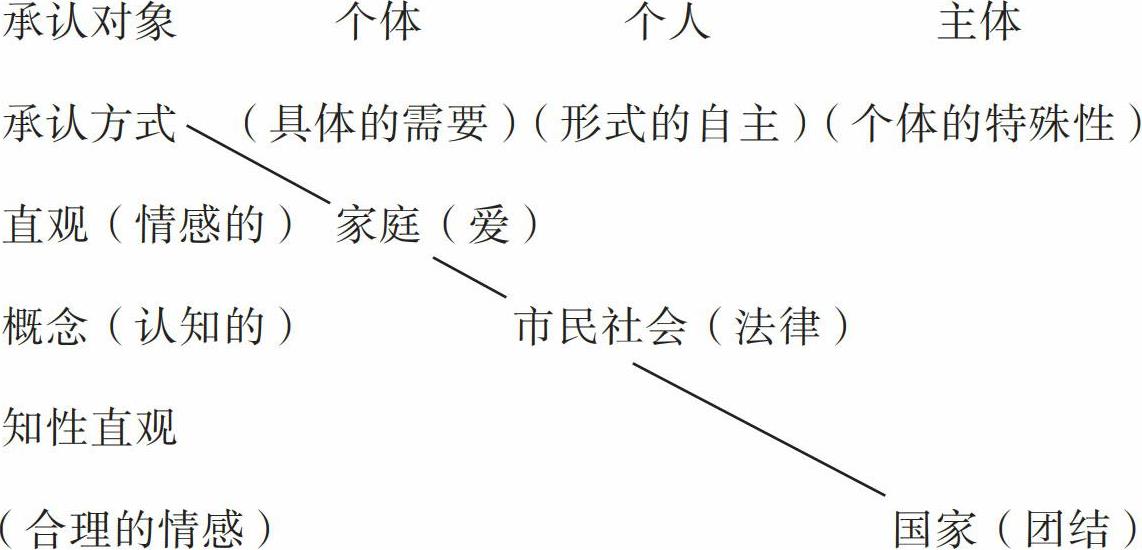 《伦理体系》在整体上不够明确,其中首先就包含这样一个问题:在什么意义上,人的伦理历史必须以承认关系的发展这一逻辑主线来进行重构?十分明显,由于黑格尔文本中亚里士多德主义的参照系统根本没有在理论上进行充分的发挥,以便把主体间承认的各种形式明确区别开来,因此,我们无疑可以反对上述理解。尽管论证过程中曾多次揭示了三种承认形式之间的区分,这些形式在实践确认的“方式”和“对象”上彼此不同:在家庭的情感承认关系中,人类个体是作为有具体需要的存在而被承认的;在法律的形式—认知承认关系中,个体是作为抽象的法人而被承认的;最后,在国家这一具有情绪启蒙意义的承认关系中,个体是作为具体的普遍,即作为特殊的社会化主体而被承认的。进一步说,如果在每一种承认关系中,制度和样态都可以更清楚地区分开来,那么,黑格尔心中的阶段理论就可以用下图表示: