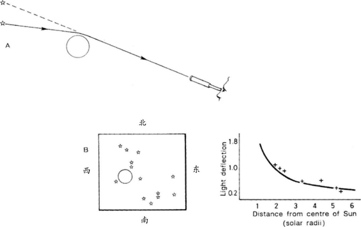 图1.3 A. 当遥远的星光靠近太阳附近时,“星光束”被太阳的引力所偏转。