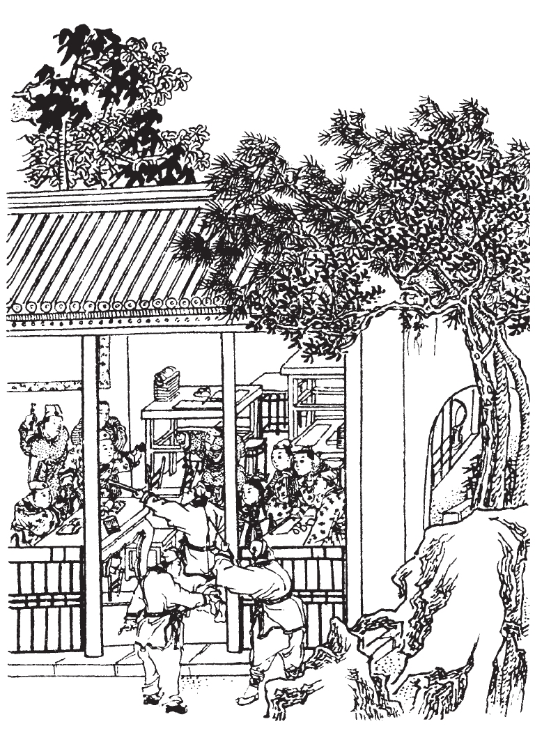 看见金荣的朋友暗助金荣,飞砚来打茗烟,偏没打着茗烟,落在他桌上,正打在面前,将一个瓷砚水壶打了个粉碎,溅了一书黑水。贾菌如何依得,就骂:“你们什么东西,这不都动了手了嘛!”骂着,也就抓起砚砖来要打回去。贾兰是个省事的,忙按住砚,极力劝道:“好兄弟,不与咱们相干。”贾菌如何忍得住,两手抱起书匣子来,照那边抡了去。终是身小力薄,却抡不到那里,刚到宝玉、秦钟桌案上就落了下来。只听哗啷啷一声,砸在桌上,书本纸片还有笔砚等物撒了一桌子,又把宝玉的一碗茶也砸得碗碎茶流。贾菌跳出来,要揪打那一个飞砚的。金荣此时随手抓了一根毛竹大板在手,地狭人多,哪里经得起舞动长板。茗烟早吃了一下,乱嚷:“你们还不来动手!”宝玉还有三个小厮:一名锄药,一名扫红,一名墨雨。这三个哪有不淘气的,一齐乱嚷:“打啊!动了兵器了!”墨雨抄起一根门闩