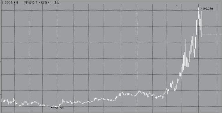 图8-1是平安转债的历史走势图,我在152元卖出平安转债之后,它最高涨到了192元,另外它最终收盘的价格是167元。这种情况下,你心里可能会有个疑问:在公司发布提前赎回公告之后,立刻就卖出,是不是太早了?是不是可以等它再涨一涨?我的建议是最好不要等。再看一下上一个案例中中行转债的走势图,你会发现,在中行转债发布提前赎回公告之后,它的价格是一路下跌的。如果你在这两个案例中都选择再等一等,平均而言并不会得到更好的结果。