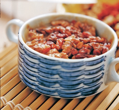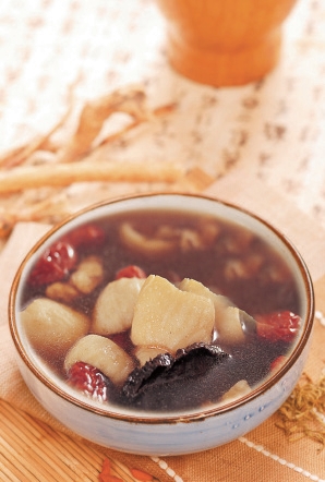 3 锅内加水适量,放入猪大肠、核桃仁、熟地、红枣、姜丝、葱末、料酒,大火烧沸,改用小火煮40~50分钟,调入盐即成。