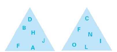 请找出两个三角形内字母的排列规律,并从中找出两个多余的字母。