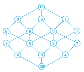 请从图形最上面的数字 10 开始,每次往下尽量寻找一条路线,直到最下面一个数字 20 为止。