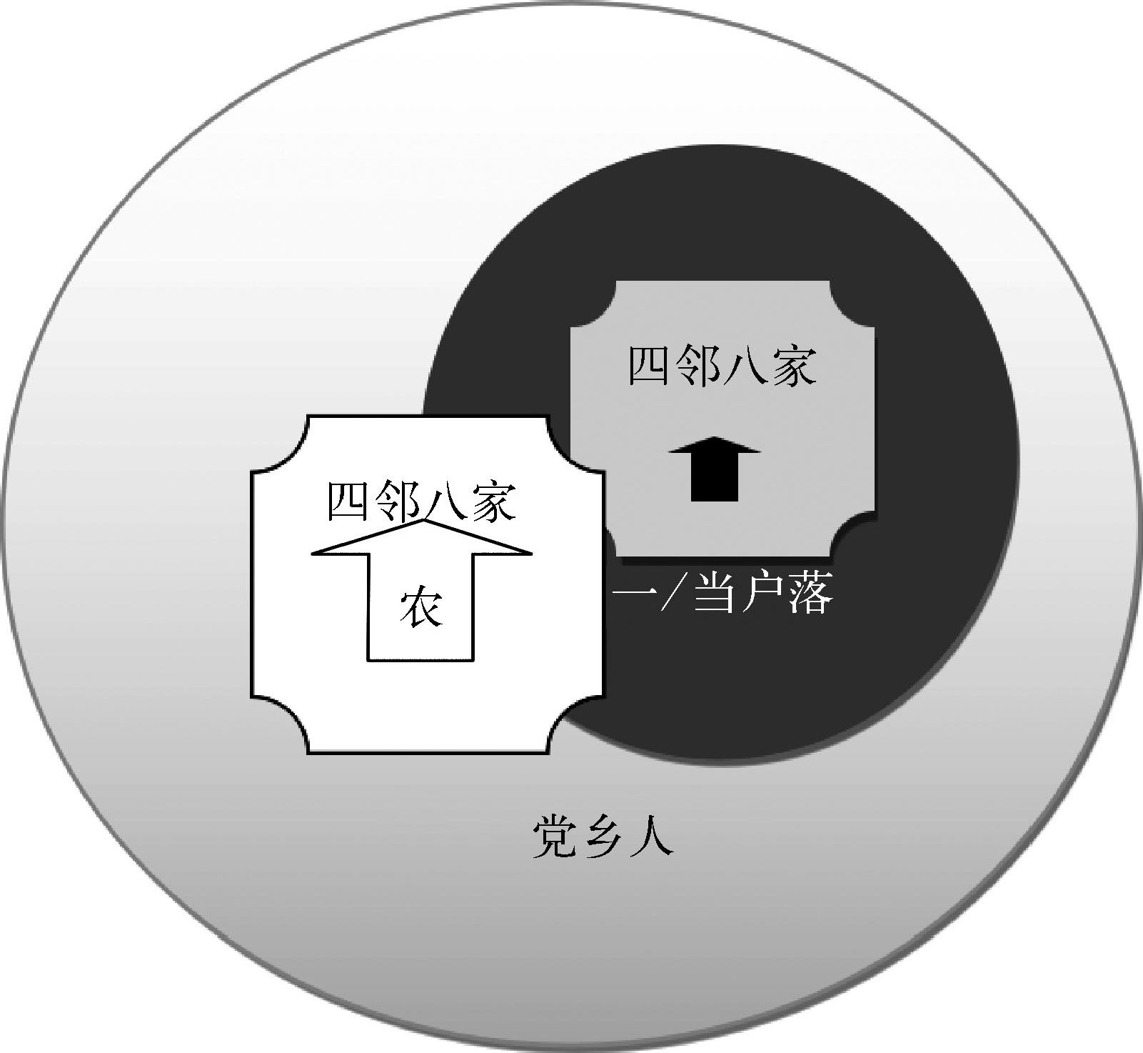 当户落的人之间时常相互帮忙、借钱借粮,不过因为住得近,相互之间发生吵包子、抬杠的概率也高,比如偶尔会因为一句话说不对头就抬杠,或是因为相邻的过道、盖房时侵占过道而发生纠纷。农户、四邻八家、一户落、村庄之间的关系可参见图2-9