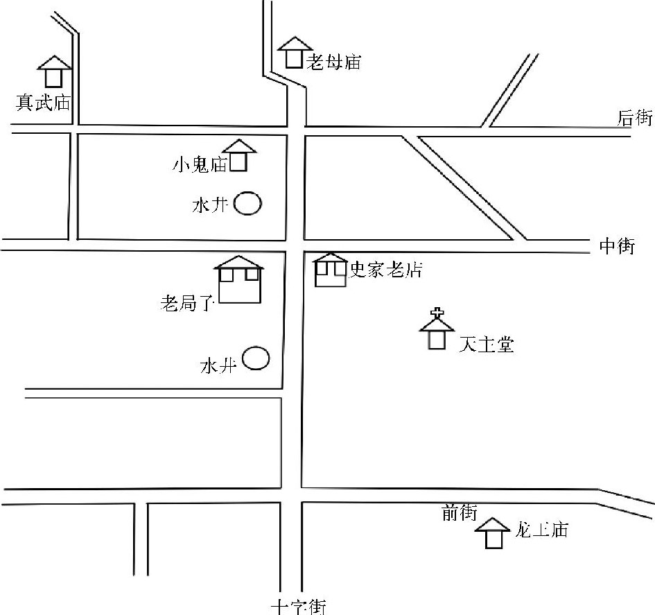 传统时期的双井村内,建有真武庙、娘娘庙、小鬼庙、老母庙、龙王庙、岔棚(官房)、天主教堂等多处神明空间,与此同时,在村民们心目中,水井自然而然成为井神的空间,他们认为每一眼水井都有一位井龙皇守护。村落的神居,不论是本土神庙还是天主教堂,均建在住房周围,它们不是村落的中心。每个神居均处在不同的方位,神居方位的选择并不是随意性的,而是依据特定的乡俗、说法,比如真武庙坐落于村落西北角,可以“威震北方”,护佑村民,其他神居比如龙王庙坐落在村落东南角、老母庙位于正北方、天主教堂修建在村庄东侧、小鬼庙在村落西北靠近主街的地方。此外,村庄还有两处官房,一处是真武庙附近的北屋,一处是南北街街口的西屋(2间左右)。