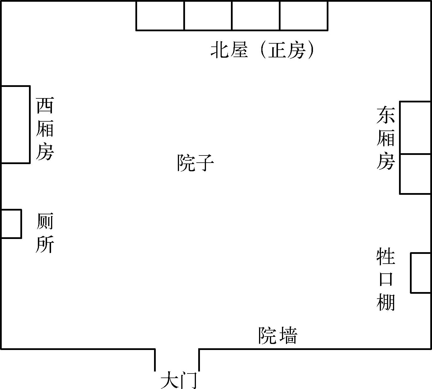 的人,“俺是一户落的、挨家挨户的,俺挨着哩!”“近的是当户落,远的是党乡人”,四邻八家属于当户落范围以内的农户。村落或户落之内,区分一家一户的重要标志是院落和大门,大门的朝向不一,但普遍为东西朝向,主房屋(正屋)一般为坐北朝南。户与户之间大门门脸的高度存在明显的差异,大户人家的门脸高,大门外表镶嵌有金属,显得尤为阔气,大门的罩棚较宽,而穷家小户的门脸相对较低,大门相对简陋(图2-8