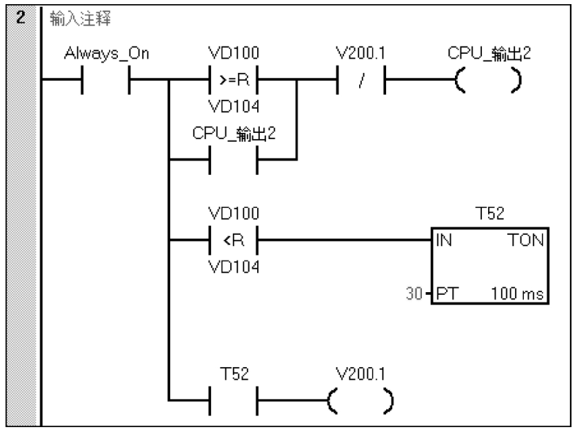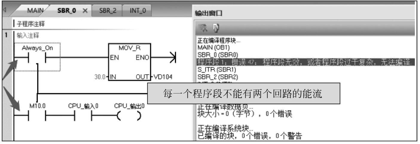 如图5.3所示,程序段1,出现了两个能流回路:一路是从Always_On开始的,终点是MOV_R指令;另一路是从M10.0开始的,终点是【CPU_输出0】线圈输出指令。这种情况是错误的、不允许的。