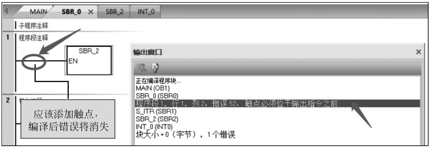 如图5.2所示,西门子S7-200 SMART编程软件不允许输出与左母线直接相连,前边一定要有一个触点指令,否则就会报错。