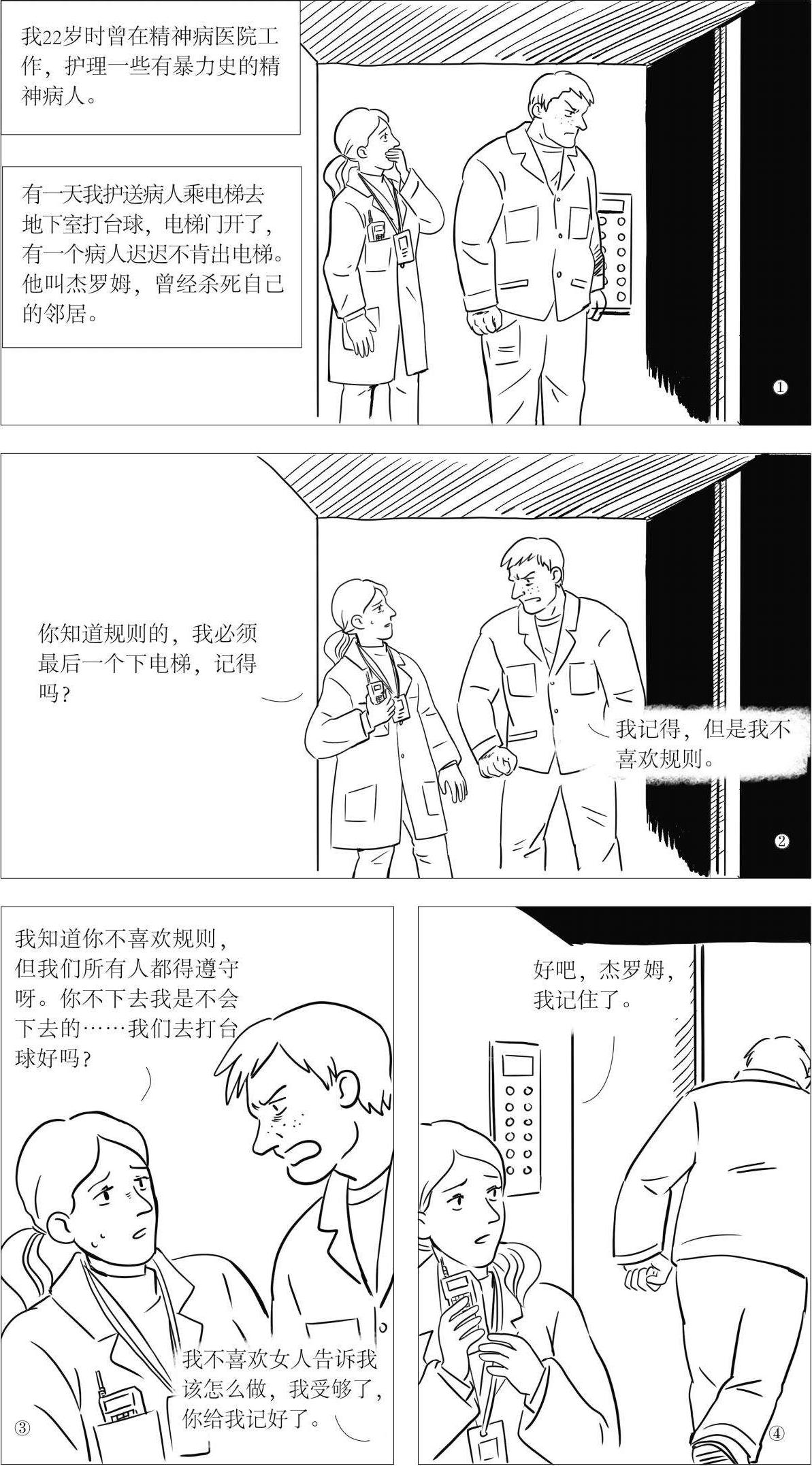 他不希望我告诉他该怎么做,我也不想做他让我做的事,这是我们的分歧所在。如果我先走,我就会背对他,这样很危险,所以我选择坚持自己的立场。首先,在我们的互动过程中,我与他建立了某种平等的联系,这样他会视我为普通人,而不是对手,更不是敌人。其次,极力表现出自信和镇定(即使我的心快跳出嗓子眼),并且让声音尽量轻柔而坚定(即使我的内心在大声呼救),这样就不会激化杰罗姆的行为。最重要的是,这样就不会强迫他遵照我的对抗指令(走出电梯),而是耐心地倾听了他的要求(不要对他指手画脚)。