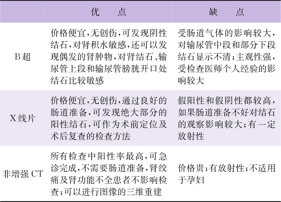 在尿路结石的诊断中,常用的检查有超声(也就是B超)、X线片以及CT,它们都有各自的优缺点(见表1-1)。
