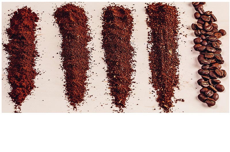 咖啡粉从细粉到粗粉依次排列。萃取时一定要选择合适的研磨粒度,否则会影响咖啡的口感和风味。极细粉没有在图片中列出,这种粒度的咖啡粉适合土耳其咖啡的萃取