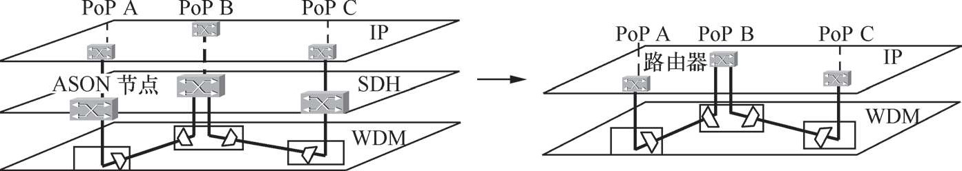 目前,SDH层的汇聚、保护、同步、组网和管理功能已经被IP层和WDM/OTN层取代,WDM/OTN被用来直接承载大颗粒的IP业务。省去SDH层可以降低网络建设成本、改善传送性能。如图1-2所示,IP over WDM/OTN组网简化了网络结构,使得传送网垂直结构扁平化。