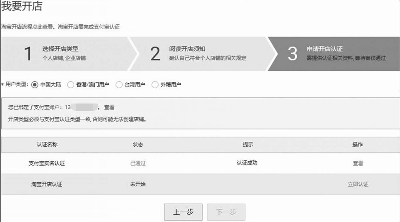 (4)点击“我已了解,继续开店”,进入“申请开店认证”界面,如图1.1.7所示。