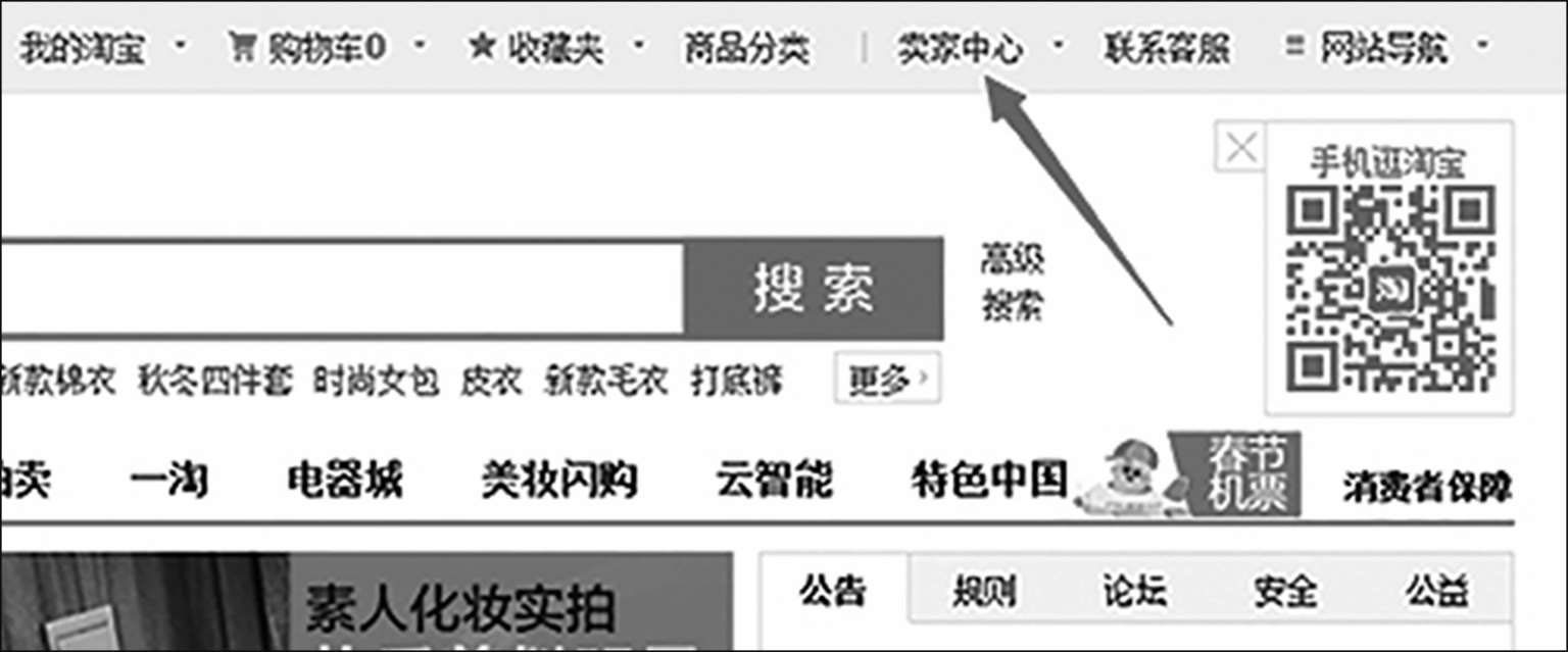 (1)打开淘宝网,登录账户,在网页右上角找到“卖家中心”,如图1.1.4所示。