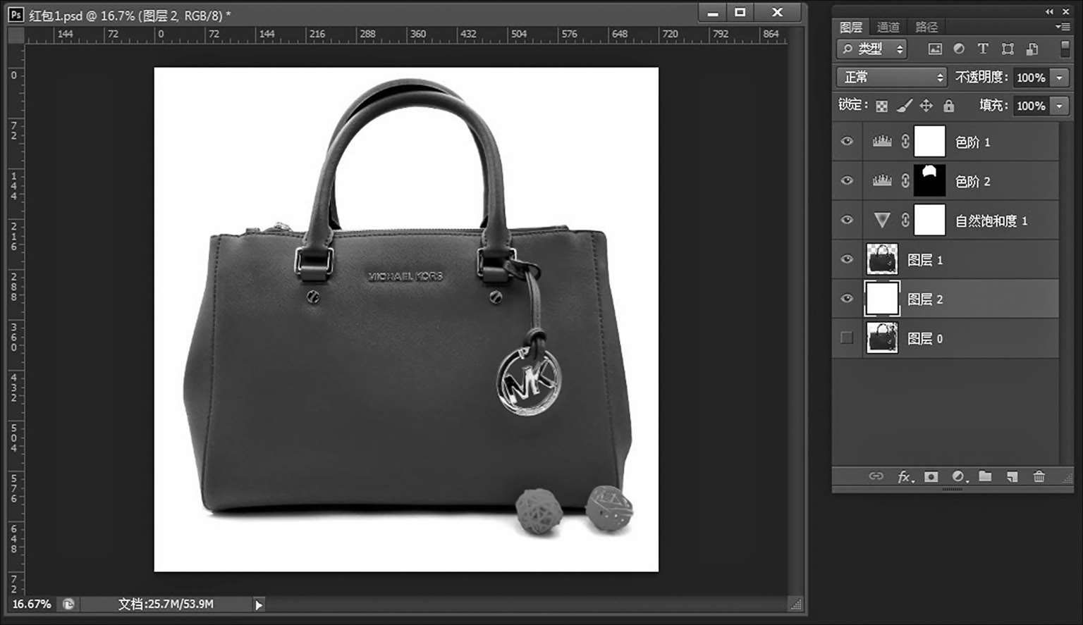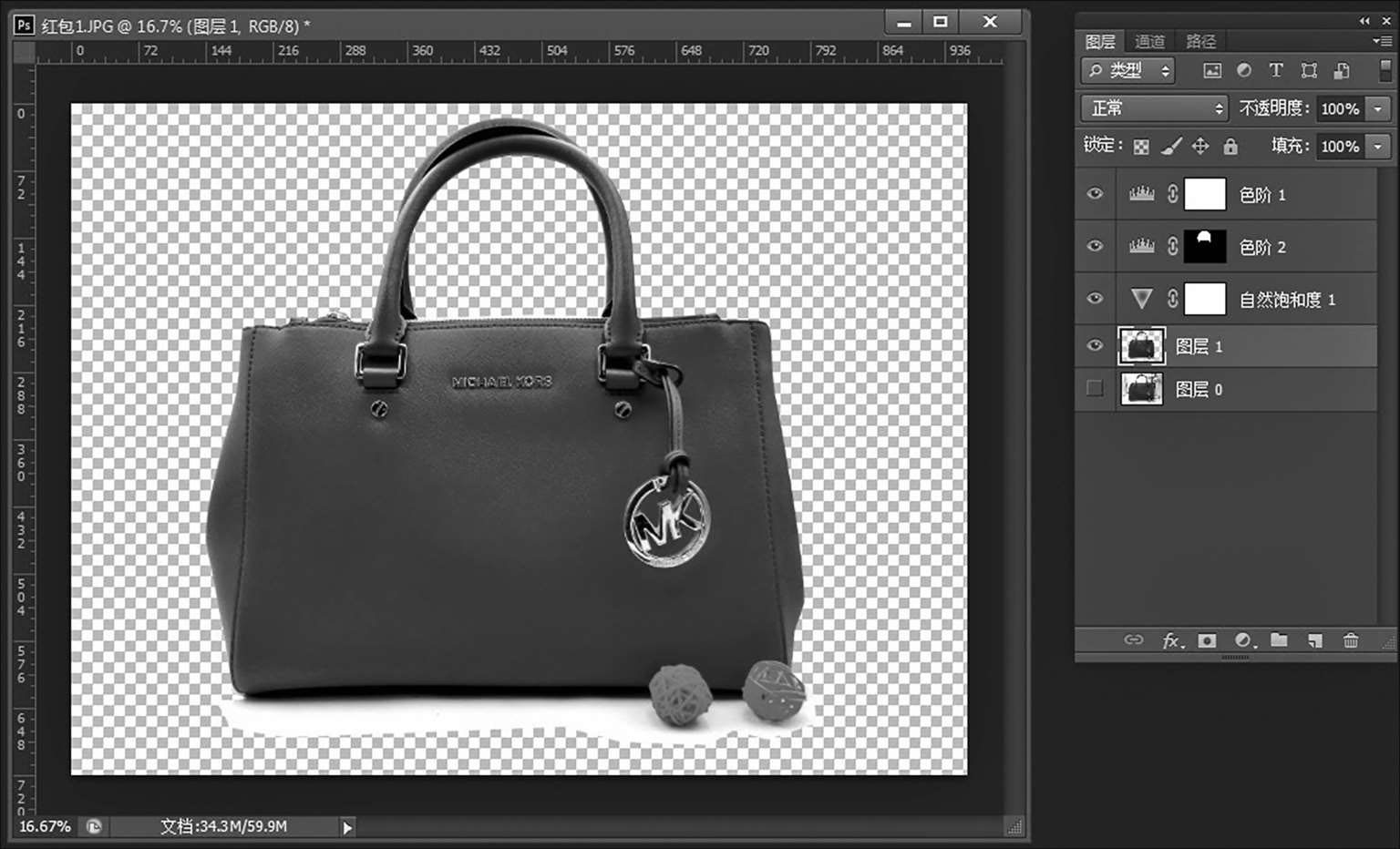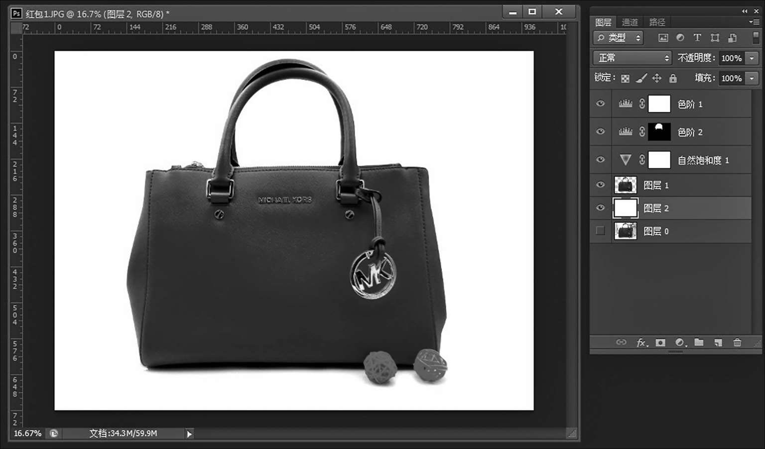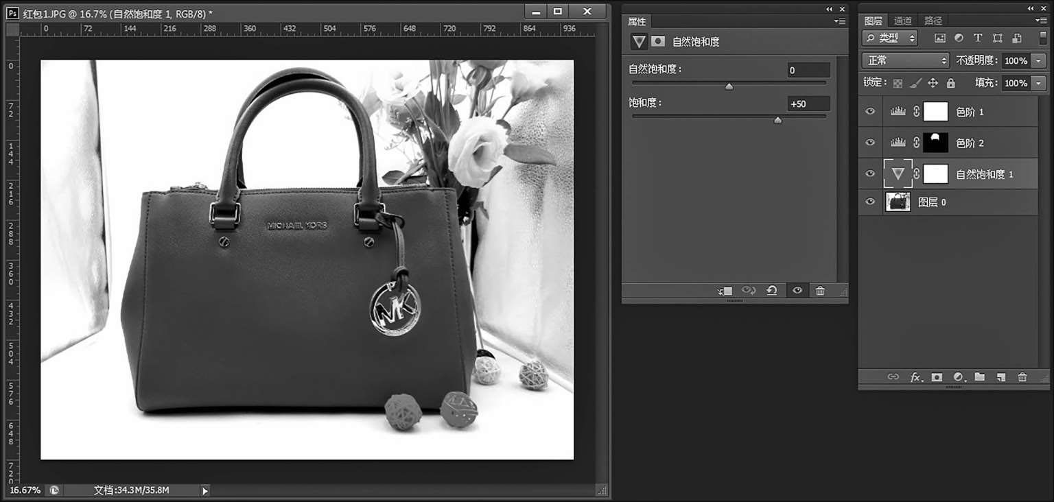 (3)再次检查图片,发现与商品实际颜色有色差,主要是颜色过于暗沉。在原图层上面添加一个“自然饱和度”调整图层,参数设置如图2.2.8所示,保存为.psd格式。