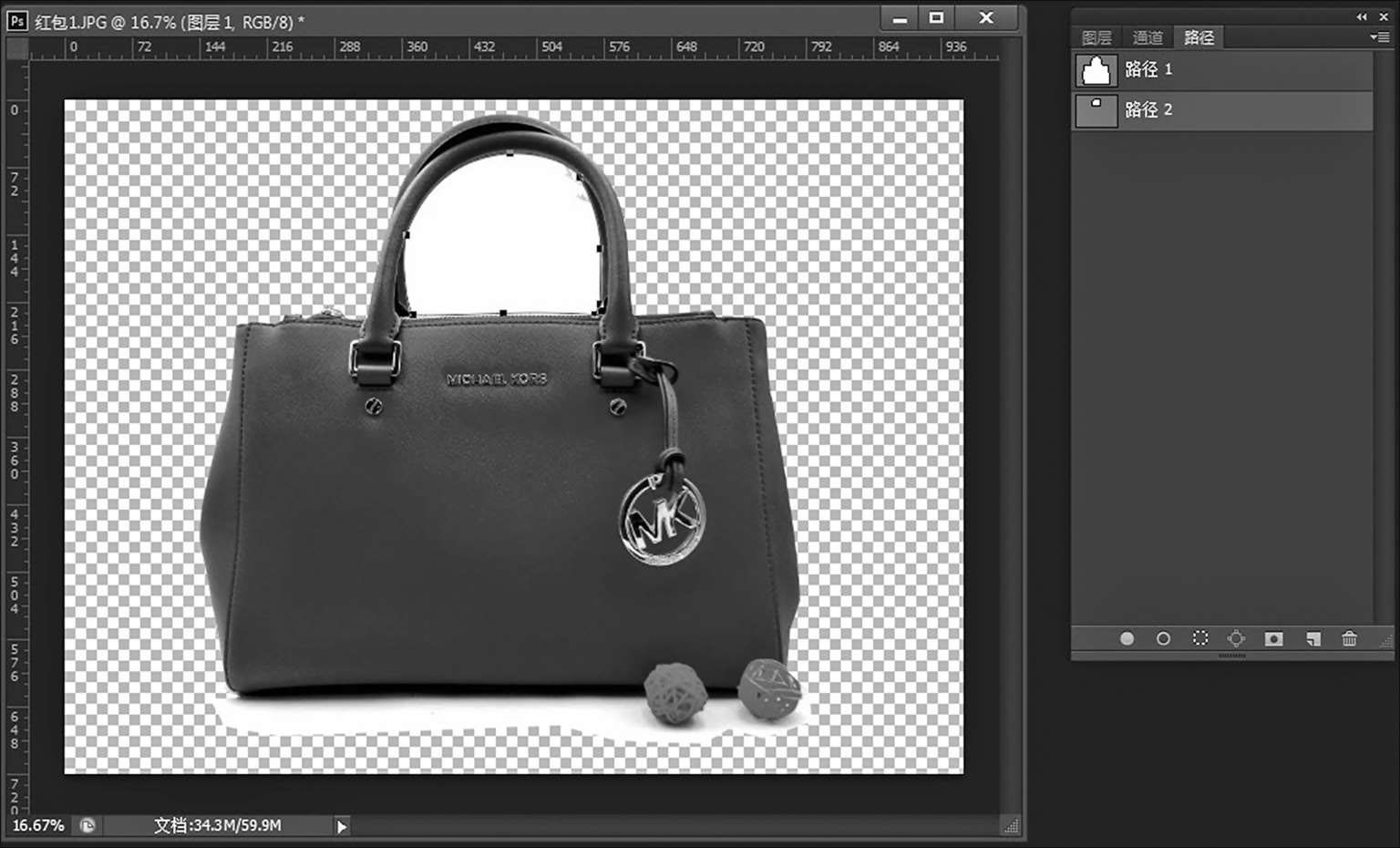 ,或按“Ctrl+Enter”快捷键,将路径转为选区,按“Del”键,删除选区里的图案,如图2.2.13所示。