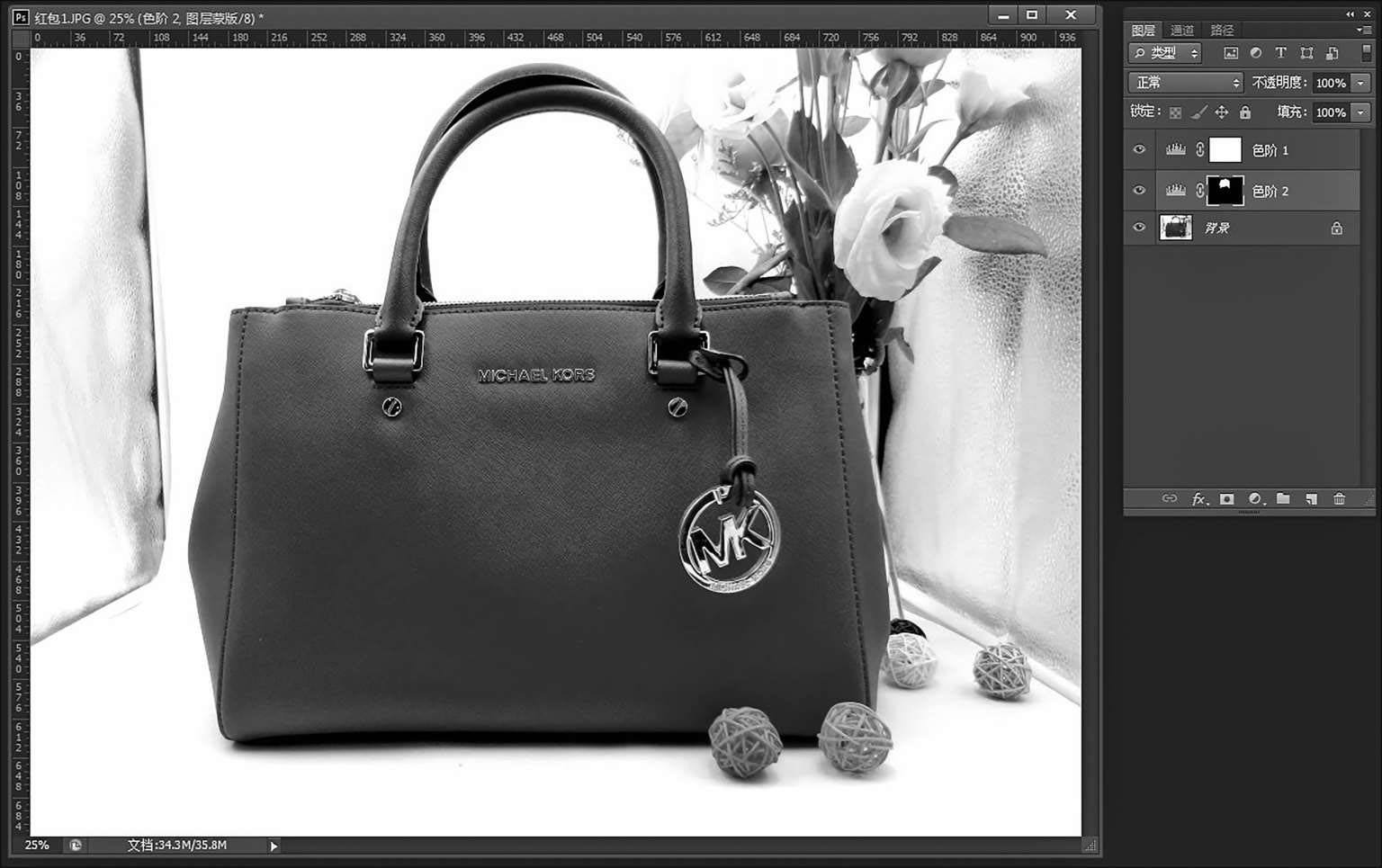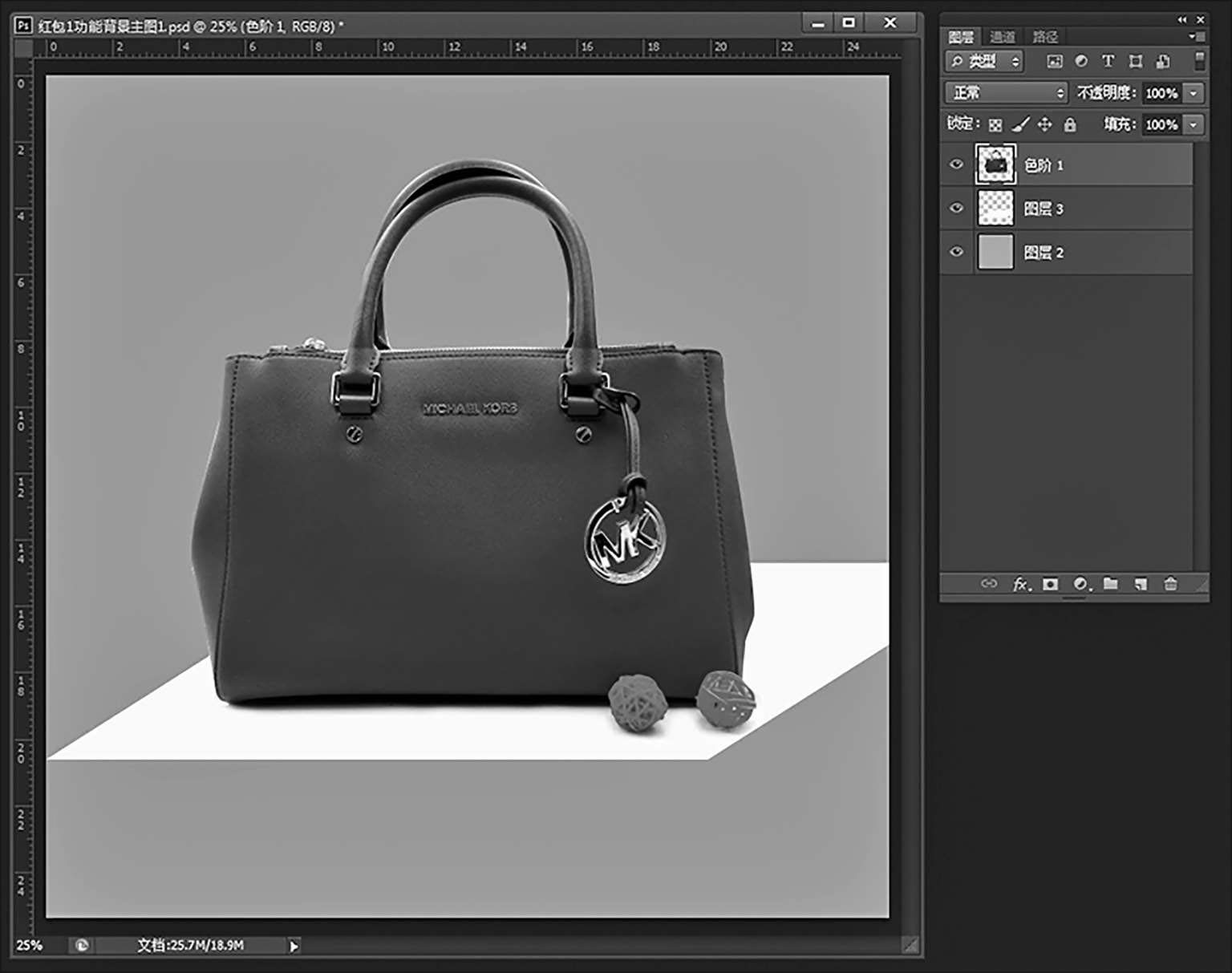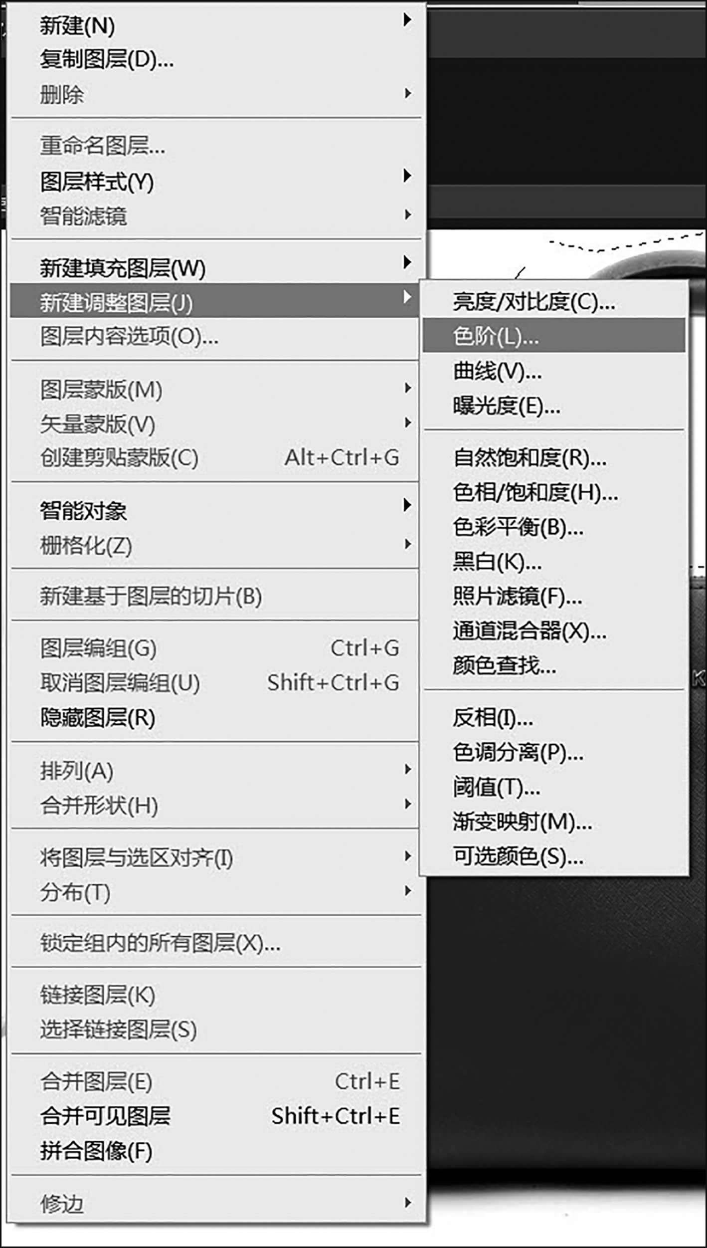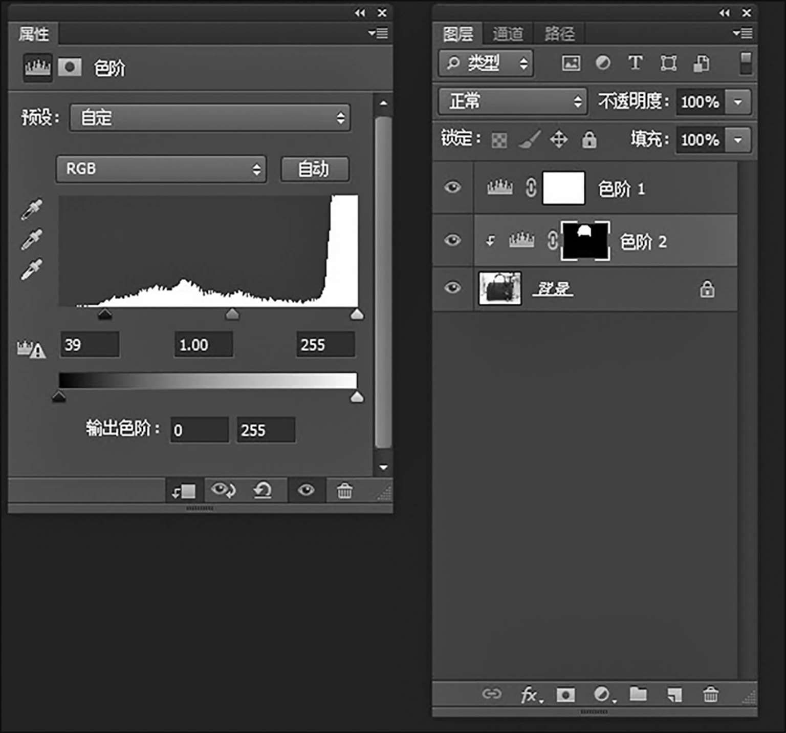 (1)打开素材“练习素材/项目2/任务2/红包1.jpg”,添加一个色阶调整图层,参数设置如图2.2.2所示。