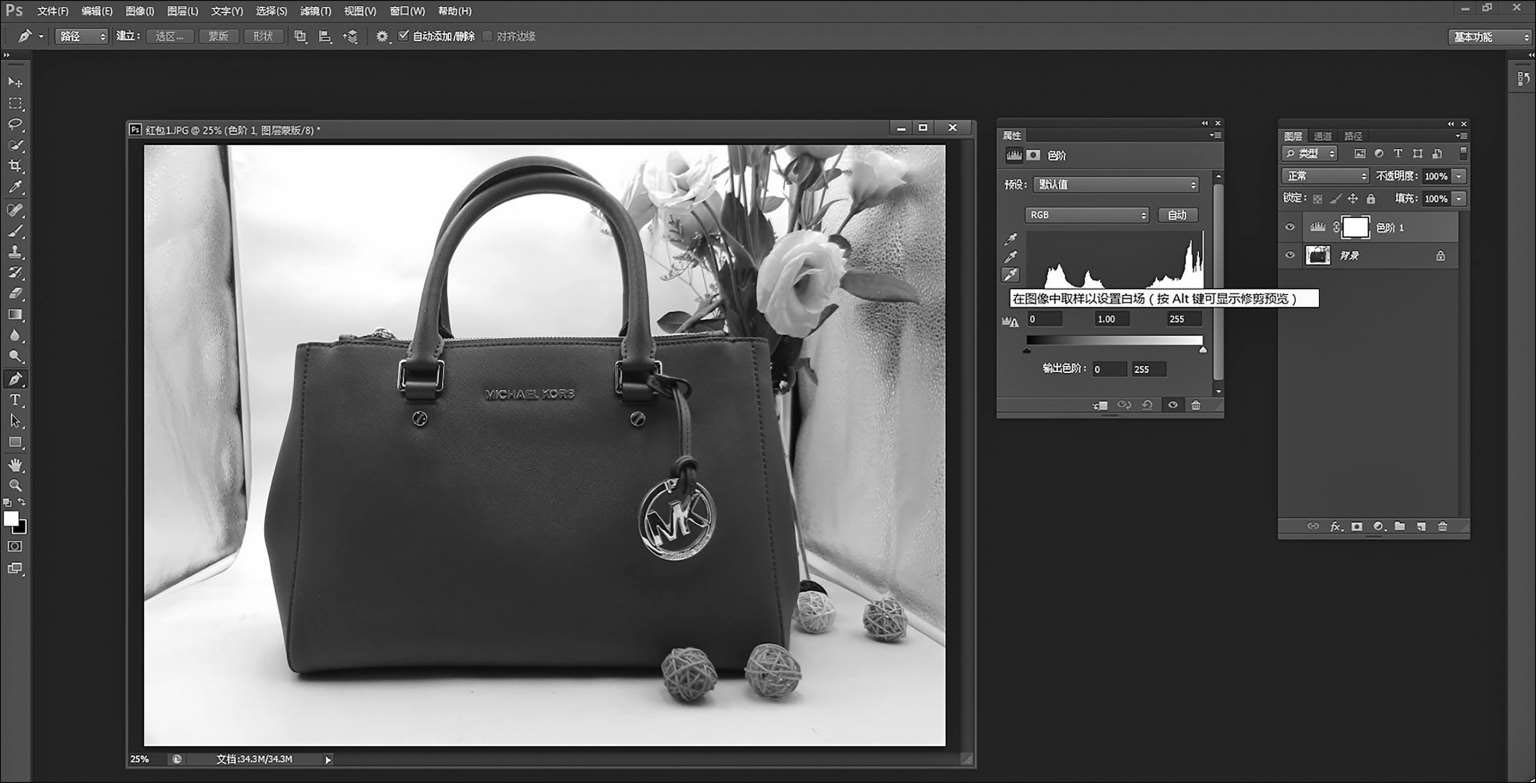 2.色阶对话框右边有3只吸管,分别为“在图像中取样以设置黑场”“在图像中取样以设置灰场”和“在图像中取样以设置白场”工具。使用它们可以在图像中自定义黑白场,重新定义最暗颜色、最亮颜色以及中间调。色阶命令将根据这些设置重新设置图像的色调。
