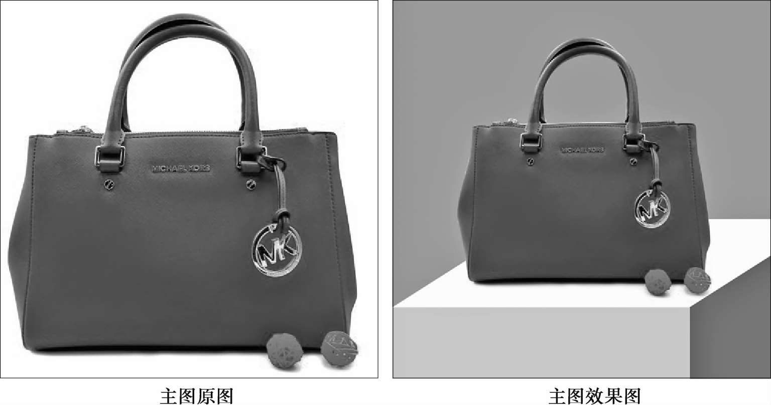 白色底图的商品图片可以作为主图使用,也可以设计一些背景如展台来烘托突出商品。白底主图与设计后的主图效果图如图2.2.16所示。
