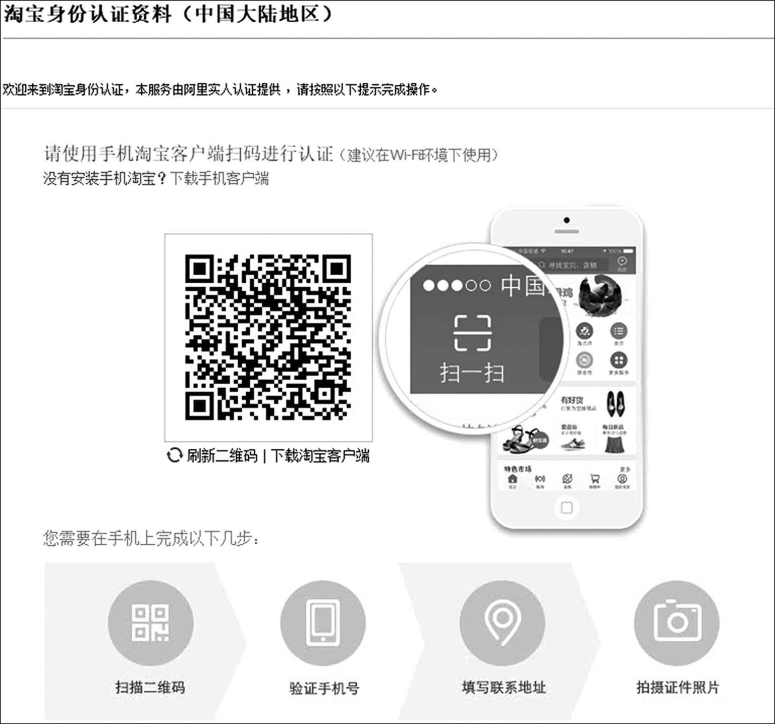 (5)点击“立即认证”,进入“淘宝开店认证”界面,扫描二维码,在手机上按照步骤完成操作,如图1.1.8所示。