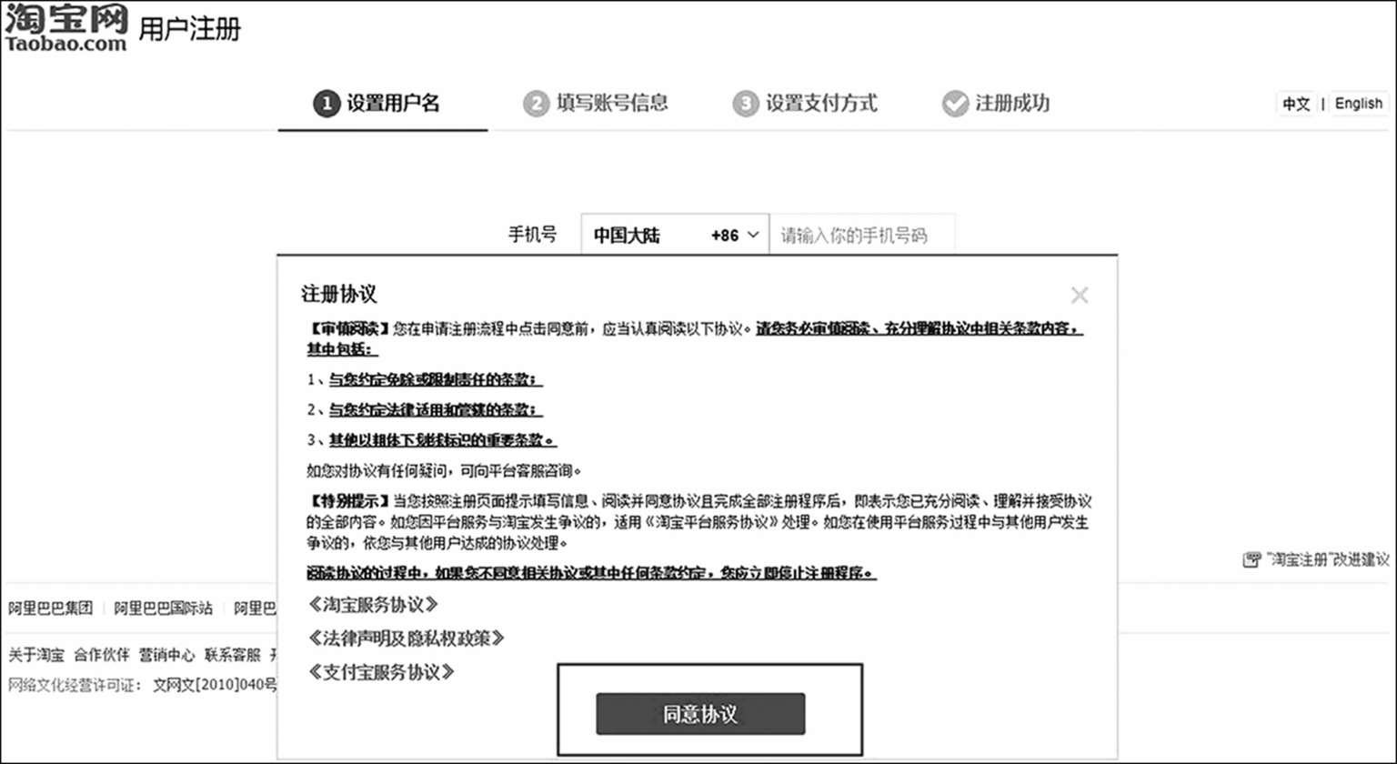 (1)登录淘宝网,点击页面上方“免费注册”,出现如图1.1.1所示界面,点击“同意协议”按钮。