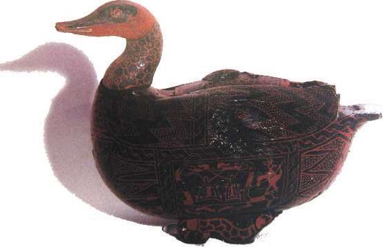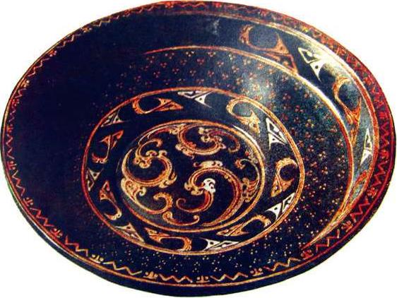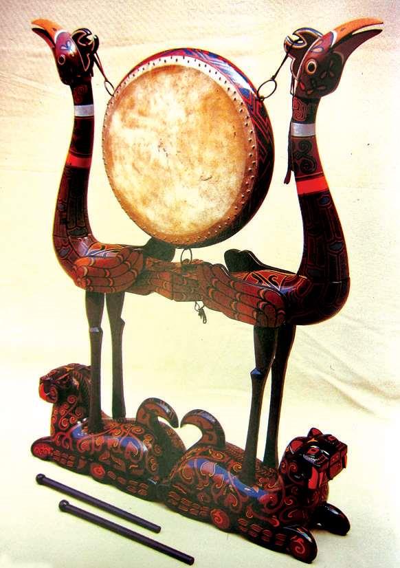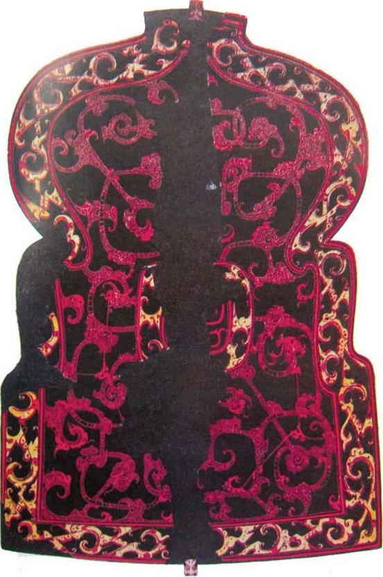 战国出土的漆器虎座鸟架鼓(图 1-5)是战国时期楚国的重要乐器。通体髹黑漆为地,以红、黄、金、蓝等色绘出虎斑纹和凤的羽毛。全器造型逼真,彩绘绚丽辉煌,创造极其奇特的令人激动的艺术风格,堪称这一时期的代表作。漆色范围扩大,漆器的装饰纹样从商、西周时期的纹样进一步图案化,战国彩绘云龙纹漆盾(图 1-6)、彩绘漆盘(图1-7)、鸳鸯形漆盒(图 1-8 ),配合器物的造型、各种不同的组合,形成充满美感的画面。