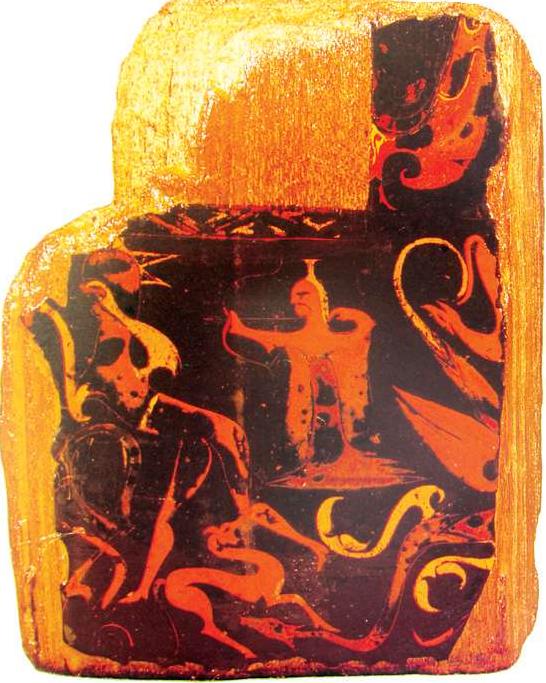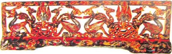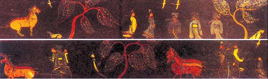 河南信阳长台关 1 号楚墓出土的彩绘狩猎图漆瑟残片(图 1-13 ),虽然已是残缺不全,但带有中国古代原始宗教巫术的神秘、浪漫的气息,因其残缺而突显其“画”的意义,绘画反映出了楚国画工熟练的彩绘技巧,也是战国早期楚国生活的真实写照。可以说,这是我国最早具有漆画概念的作品。彩绘龙凤纹漆内棺各种神怪形态诡异,其布局、造型和韵律极富装饰性和时代特征,是汉代画像石艺术样式的杰作。