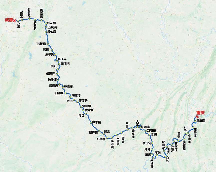 成渝铁路西起四川省成都市,横贯四川省中部,途经3个市共20个县(区),东至重庆市,全线长505km。在275.85km处进入重庆市界,重庆市内线路长229.21km,设29个车站。重庆段沿线有众多大中型厂矿企业,25个车站与成渝公路、地方公路相通,并与重庆的九龙坡、猫儿沱、朱杨溪码头衔接,货物可通过长江水道直达武汉、南京、上海。