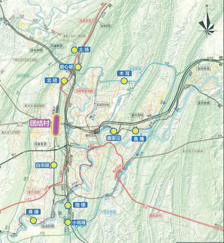 货运系统方面,形成“1+8”格局。以团结村铁路集装箱中心站为中心,枢纽内设有磨心坡、北碚、白市驿、珞璜、黄磏、小岚垭、唐家沱、鱼嘴8座货站。团结村铁路集装箱站是全国18个铁路集装箱中心站之一,占地2 200多亩,目前年办理集装箱能力达到48万标箱。重庆港果园港区通过铁路专用线与鱼嘴站相连接,实现水陆无缝衔接,可与渝新欧大通道直通。