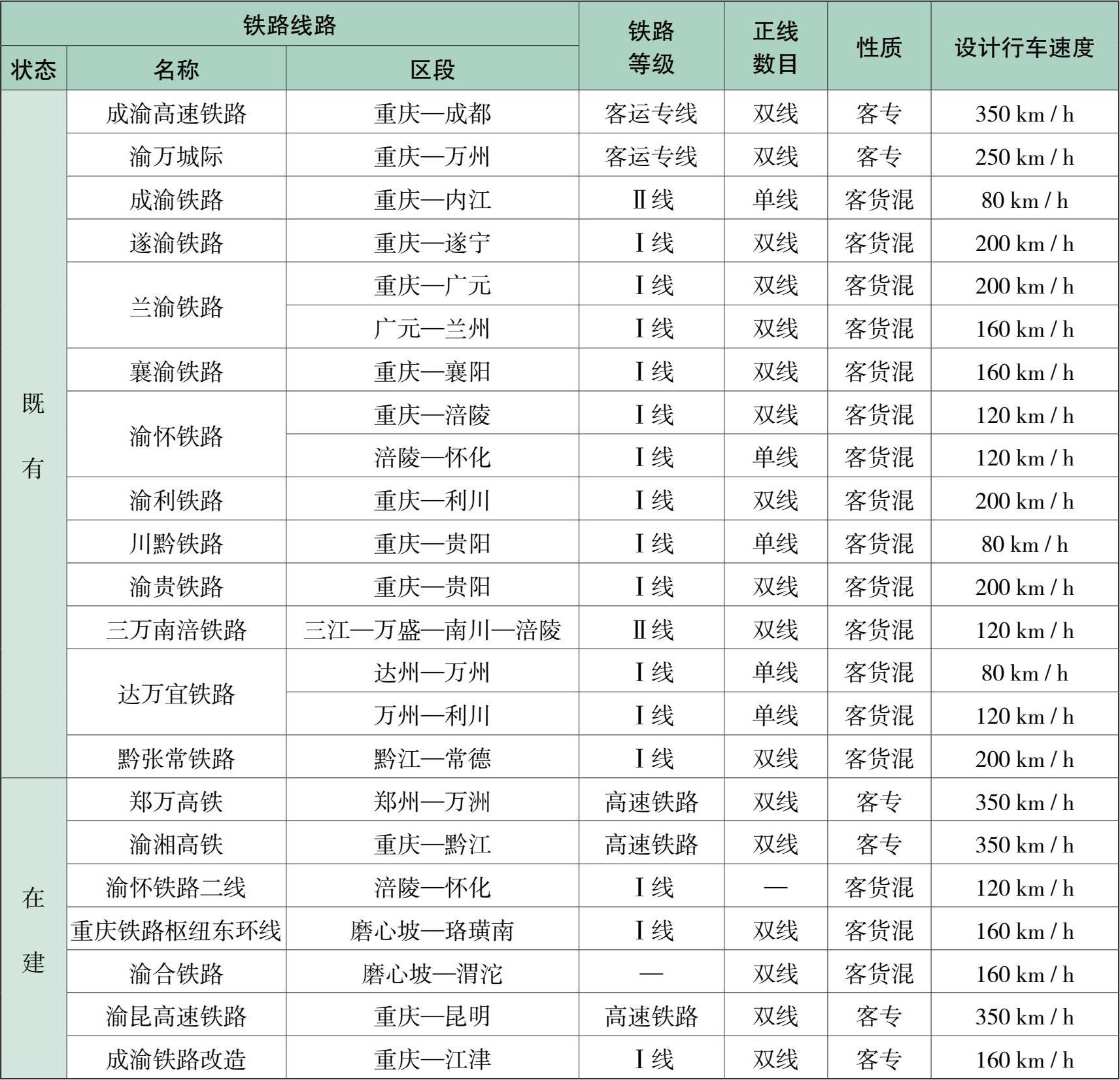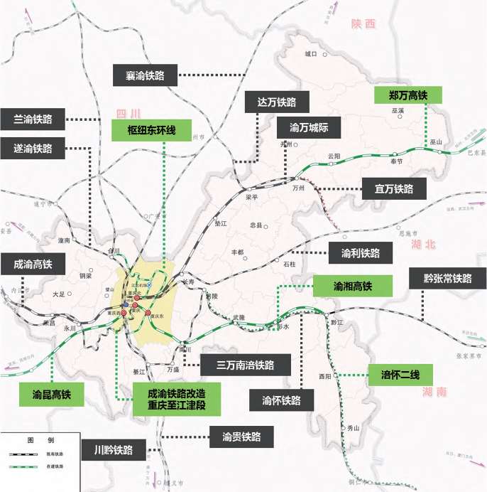 目前,既有的10条铁路干线(成渝铁路、遂渝铁路、成渝高速铁路、兰渝铁路、襄渝铁路、渝万城际铁路、渝利铁路、渝怀铁路、川黔铁路、渝贵铁路)组成了重庆通往市外的七大通道,加上在建的渝湘高铁、郑万高铁、渝昆(重庆—昆明)高铁、西渝(西安—重庆)高铁,将形成重庆连接成都、兰州、西安、郑州、武汉、长沙、贵阳、昆明的八大区域性交通通道。