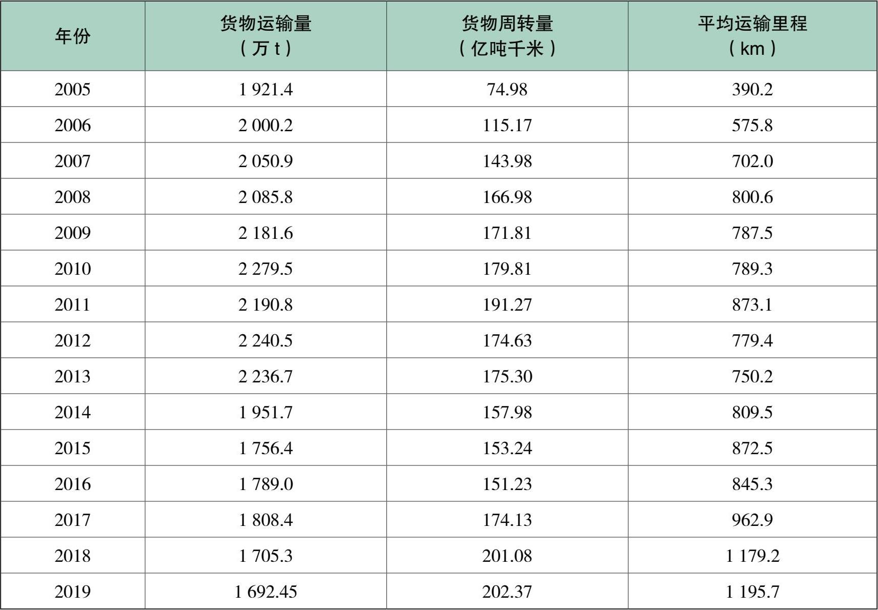 进入21世纪以后,随着高速公路的发展,铁路中短途运输货物有转向公路运输的趋势。同时,随着重庆产业结构调整的深化,本地煤炭等大宗货物通过铁路发送数量大幅度减少。新投产的綦江安稳电厂(2×15万千瓦+ 2×60万千瓦)、万盛官坝电厂(2×30万千瓦),实际上属于坑口电厂,吃掉了松藻煤矿和南桐煤矿的相当一部分产量。关井压产大幅度减少了本地煤炭产量,由最高年产4 000万t,减少到1 000多万吨。本市各大电厂用煤由本地为主供应转向调入陕西、贵州煤炭。因此,近年来重庆铁路运输格局发生了重要转折,大宗货物运输量减少,高附加值长距离货物运量增加,对运输质量和时效提出了更高的要求。2019年与2005年相比,全市铁路货运量减少229万t,减少12.0%;货物周转量增加127.39亿吨千米,增长1.70倍;货物运输里程由390.2km增加到1 195.7km,增长2.04倍。近30年来,我国铁路货物平均运输距离一直维持在700多千米。过去重庆货物运距远低于全国水平,现在已经超过全国水平。预计今后重庆货物平均运输距离,将会随着渝新欧通道、国际陆海大通道的扩展,还将进一步延长。
