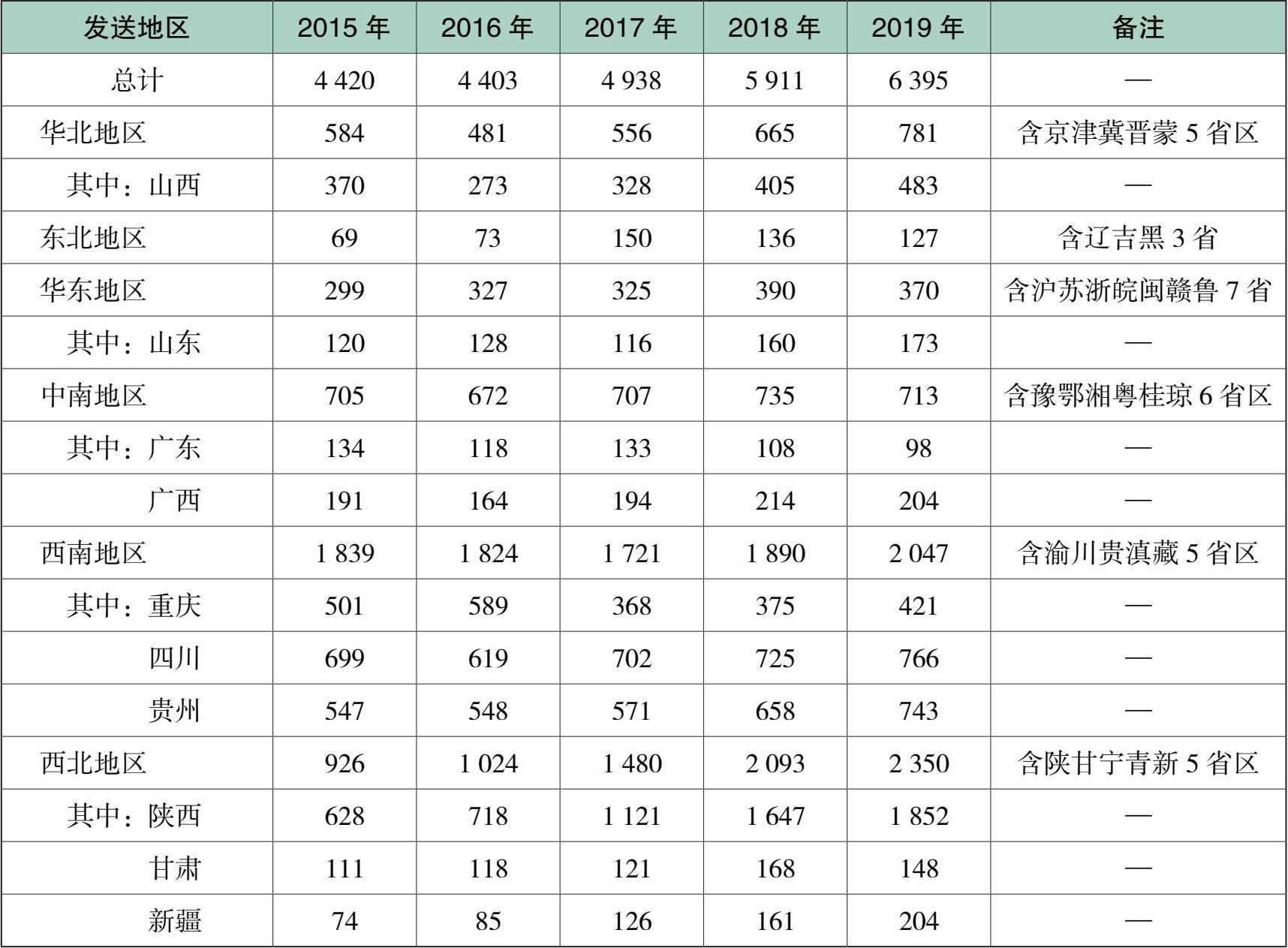 值得注意的是,重庆作为国家中心城市和国家级物流中心,每天要吸纳各地大量的物质资源。近年来,全国国家铁路地区间货物交流量平稳增长,而运达重庆的货物量却一直持续快速增长。2019年,国家铁路运达重庆的货物达到6 395万t,比2015年增长44.7%,平均每年增长9.7%,超过同期全国国家铁路地区间货物交流增长率3.7个百分点。各地区运达重庆货物量增长最快的地区是西北地区,2019年达到2 350万t,占各地货物抵渝总量的36.75%。陕西运达重庆货物量为1 852万t,比2015年增长1.95倍。现在,陕西省已经成为重庆市最大的物资调入地区。新疆是增长率仅次于陕西的省区。西北地区运达重庆的货物主要是煤炭,预计今后增长趋势将长期保持下去。除了重庆自身对西北优质煤炭的需求外,通过重庆港口转运长江中下游地区,将成为西北煤炭外运的一个主要通道。这本是国家能源长远发展规划所确定的,随着铁路通道的增加将变成现实。此外,西北各省区进口海外的优质铁矿砂和铝土矿,通过长江运输经重庆转运,亦将是一大增长趋势。