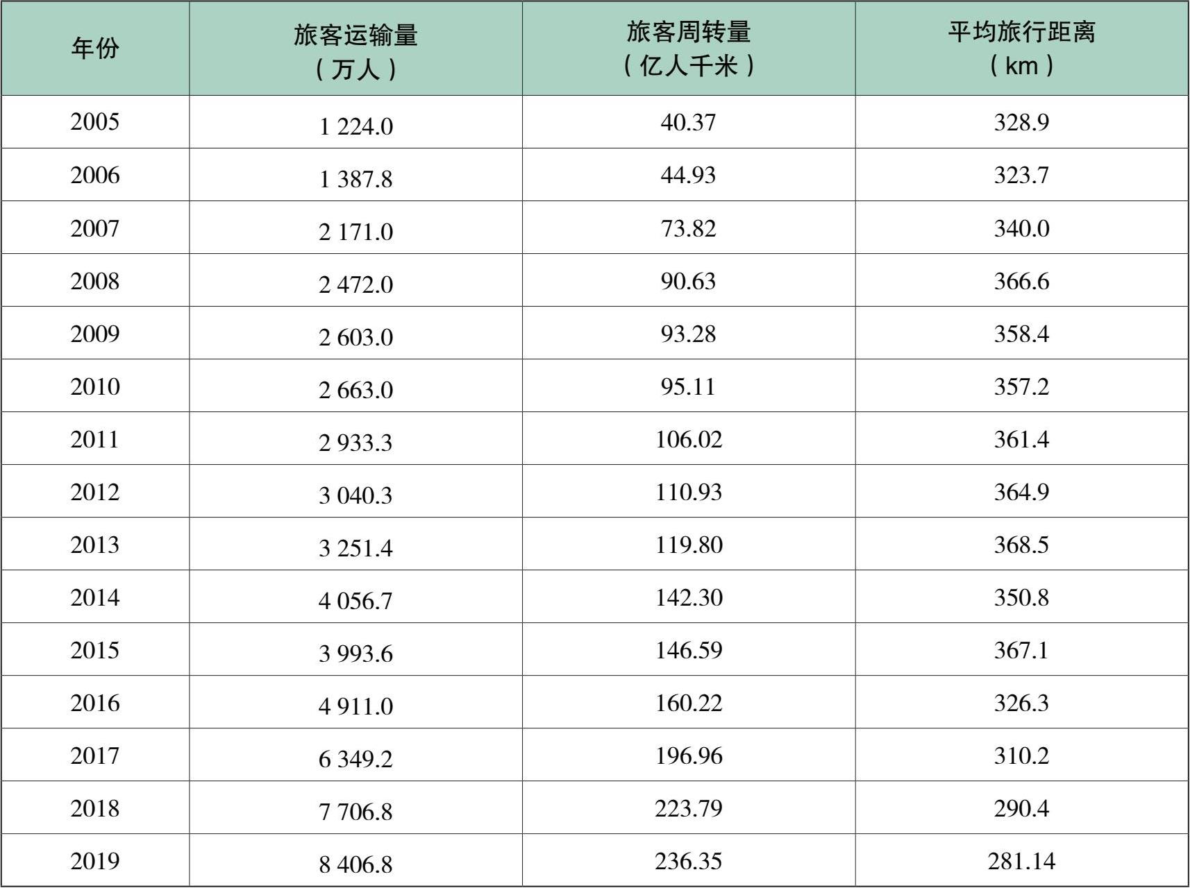注:①旅客运输量即发送量,旅客不论行程远近或票价多少,均按一人一次统计;旅客周转量,通常按发出站与到达站之间的最短距离计算,也就是票价距离计算,计算公式为:旅客周转量=∑旅客运输量×旅行距离。
