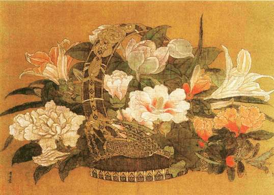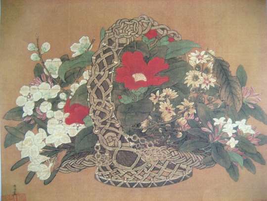 还是来看图像吧。南宋宫廷画师李嵩,绘有一套《花篮图》,分为春夏秋冬四幅,其中《夏花篮图》现收藏于北京故宫博物院,《冬花篮图》现收藏于台北故宫博物院,《春花篮图》流落于日本,《秋花篮图》则已经失传。有人说,李嵩这套《花篮图》系列是世界上最早的静物画,这个我们不去管它,重要的是,我们可以透过这一套写实性很高的图像,观察宋朝人是如何以竹篮为器皿、四季花草为配材来完成一件插花作品的。