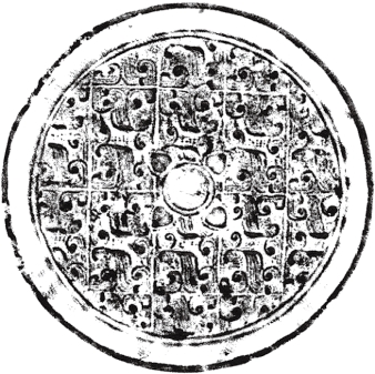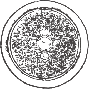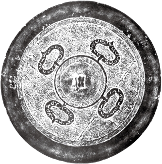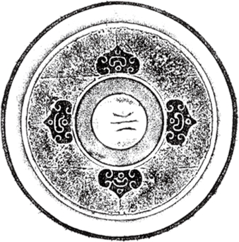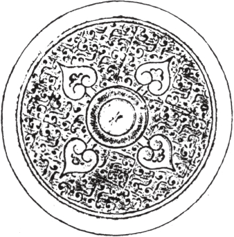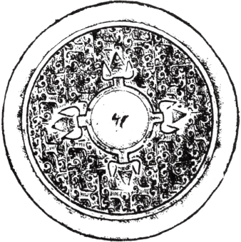 圆形。四弦钮,围以凹面圈带。纹饰由地纹与主纹构成。地纹有云雷纹、目纹、钩纹等,错落分布,呈现隽秀流动之美。主纹为向内或向外伸出的四叶交错配置。素缘。直径10.5厘米。湖南长沙战国晚期墓出土。《长沙楚墓》249页图二〇五。
