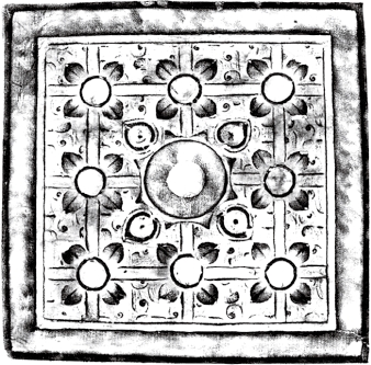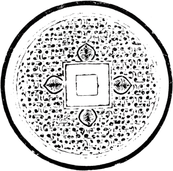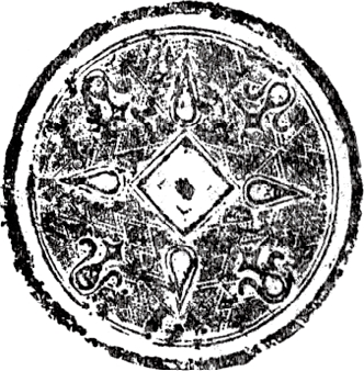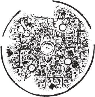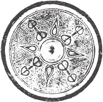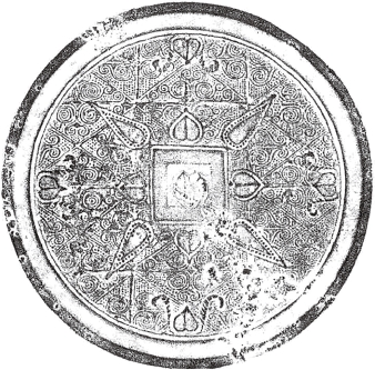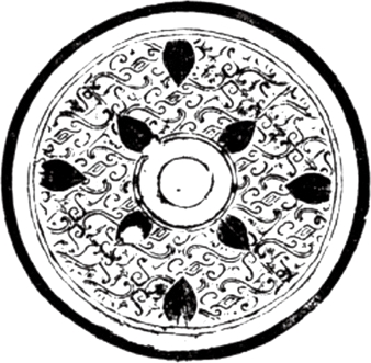 圆形。弦纹钮,围以圆圈带。纹饰由地纹与主纹构成。地纹为羽状纹。主纹为钮外圈带向外伸出桃形的四叶。直径12厘米。湖北鄂城楚墓出土。《鄂城楚墓》图二二(《考古学报》1983年2期245页)。