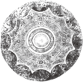 圆形。三弦钮,围以圆圈带。纹饰由地纹与主纹构成。地纹为羽状纹。主纹为八叶四花瓣纹,花瓣由凹圆形花蕊和四花瓣组成。圆圈带和近缘处各伸出四片叶纹。素卷缘。直径11.7厘米。湖南资兴战国中期墓出土。《湖南资兴旧市战国墓》图二〇 .3(《考古学报》1983年1期113页)。