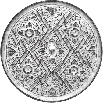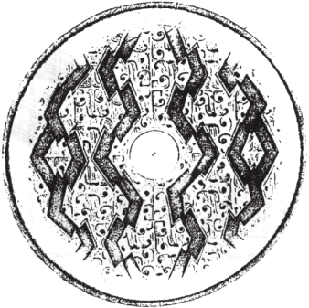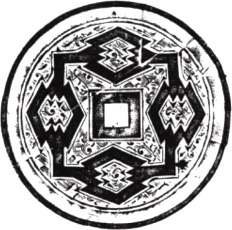 圆形。三弦钮,围以凹面方格。纹饰由地纹与主纹构成。地纹为羽状纹。主纹为折叠式菱形纹,磬形与直角宽带穿插连接成四个菱形及一个正方形。直径12.4厘米。湖南长沙战国晚期墓出土。《长沙楚墓》243页图一八五。