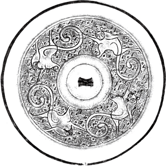圆形。环钮,圆钮座。圈带将纹饰分为内外二区。内区三兽,回首翘尾。外区五兽,低头翘尾。八兽的身躯都布满粟粒纹。素宽缘。直径8.2厘米。山西长治分水岭53号墓出土。《山西长治分水岭战国墓第二次发掘》图二七(《考古》1964年3期134页)。
