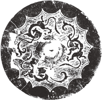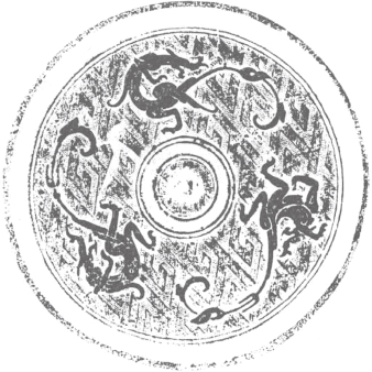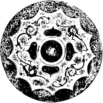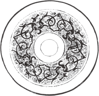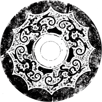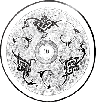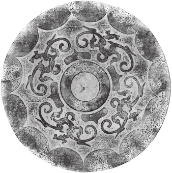圆形。钮外围以凹面圈带。纹饰由地纹与主纹构成。地纹为云雷纹。主纹为四龙绕钮与扁形四叶相间环列,龙头居中,回首曲身,张吻露齿,尾粗短勾卷,龙的双翼和双足位于身躯两侧,向外舒展。十二内向连弧纹缘。直径14厘米。湖南长沙战国晚期墓出土。《长沙楚墓》259页图二三五。
