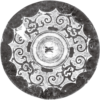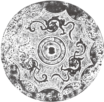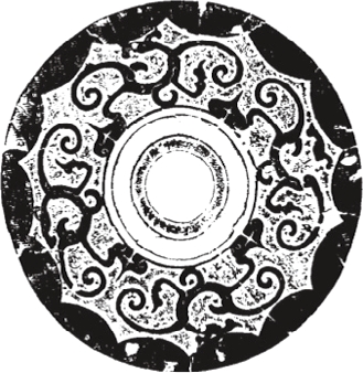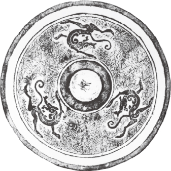 圆形。弦纹钮,围以凹面圈带。纹饰由地纹与主纹构成。地纹为双线折叠式菱形纹,双线内有并排的圆点纹。地纹之上,三龙绕钮分离配列,龙回首后顾,身躯作圆涡蟠曲,肢爪伸张,长尾高甩。十五内向连弧纹缘。直径13.6厘米。湖南长沙汉墓出土。《长沙西郊桐梓坡汉墓》图二一.4(《考古学报》1986年1期80页)。