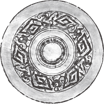 圆形。双弦钮,围以凹面圈带。纹饰由地纹与主纹构成。地纹为折叠式菱形纹,菱边中排列圆点纹,菱形内为云雷纹。主纹为三龙绕钮环列。龙有角,嘴微张,回首曲身,尾细长,向上竖起,末端内卷。四肢左右伸张,劲健有力,身躯饰圆圈和弧线。素卷缘。《尊古斋古镜集景》171页。