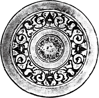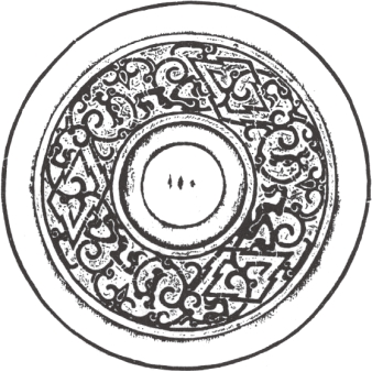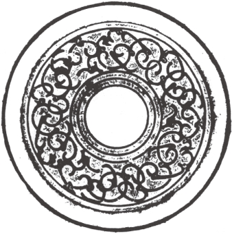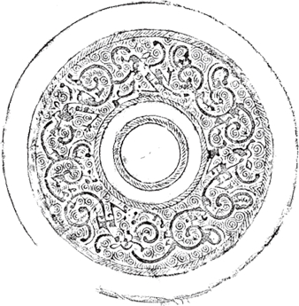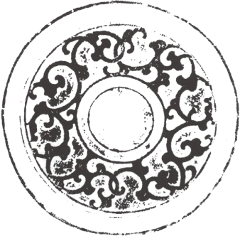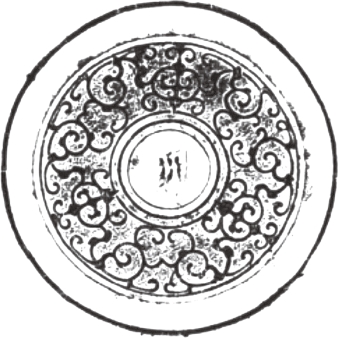 圆形。三弦钮,围以弦纹圈带。纹饰由地纹与主纹构成。地纹为圆涡云纹。主纹为三蟠螭,螭头贴近弦纹圈,身躯勾连缠绕。素卷缘。直径15厘米。湖南资兴战国晚期墓出土。《湖南资兴旧市战国墓》图二〇 .4(《考古学报》1983年1期113页)。