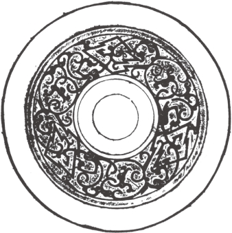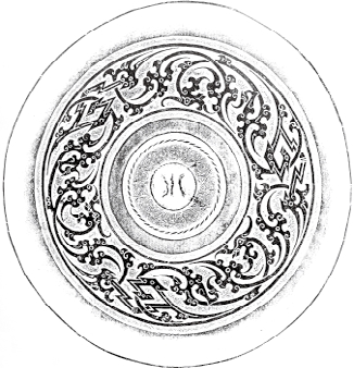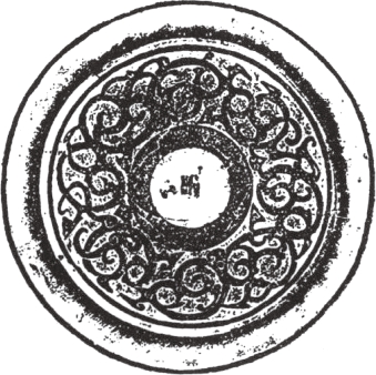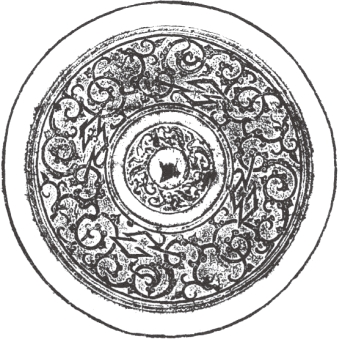 圆形。三弦钮,圆钮座,外围凹面形环带一周。纹饰由地纹与主纹构成。地纹为云雷纹。主纹为四蟠螭四叶相间环绕,蟠螭的头部斜对镜缘,张嘴,体躯弯卷,一足伸出至镜边缘,另一足踏在钮座外的弦纹圈上。从螭的腹部向两侧各伸出一向内弯卷的枝条,互相对称。宽素卷缘。《铜镜图案》6页右上。
