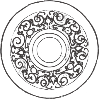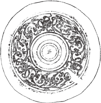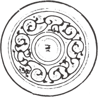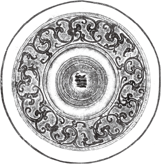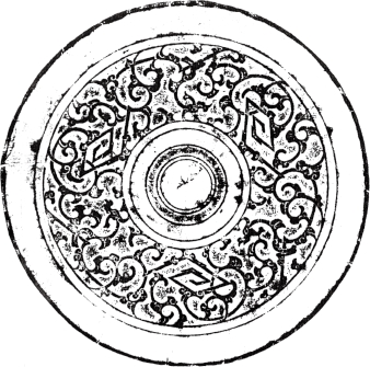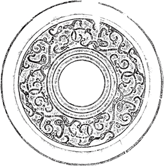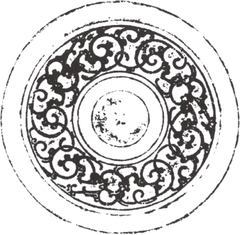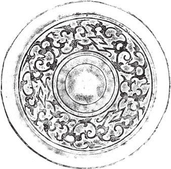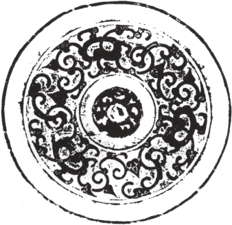 圆形。三弦钮,围以凹面圈带。纹饰由地纹与主纹构成。地纹为细密的云纹与碎点纹。主纹为三蟠螭三菱纹,蟠螭张嘴回首,身躯如弯卷柔长的枝条,勾连交错并与折叠菱形纹叠压。素卷缘。直径14.1厘米。湖北云梦西汉初年墓出土。《湖北云梦睡虎地秦汉墓发掘简报》图二〇 .1(《考古》1981年1期40页)。
