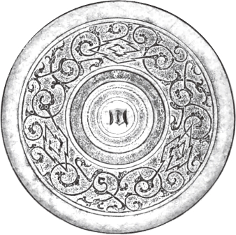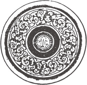 圆形。三弦钮。钮外有二周弦纹。纹饰由地纹与主纹构成。地纹为细密的云雷纹。主纹为三蟠螭,螭回首后顾,身躯呈多重S形卷曲,各部分结构不明确。素卷缘。直径12.8厘米。湖北云梦秦墓出土。《湖北云梦睡虎地秦汉墓发掘简报》图二〇 .2(《考古》1981年1期40页)。